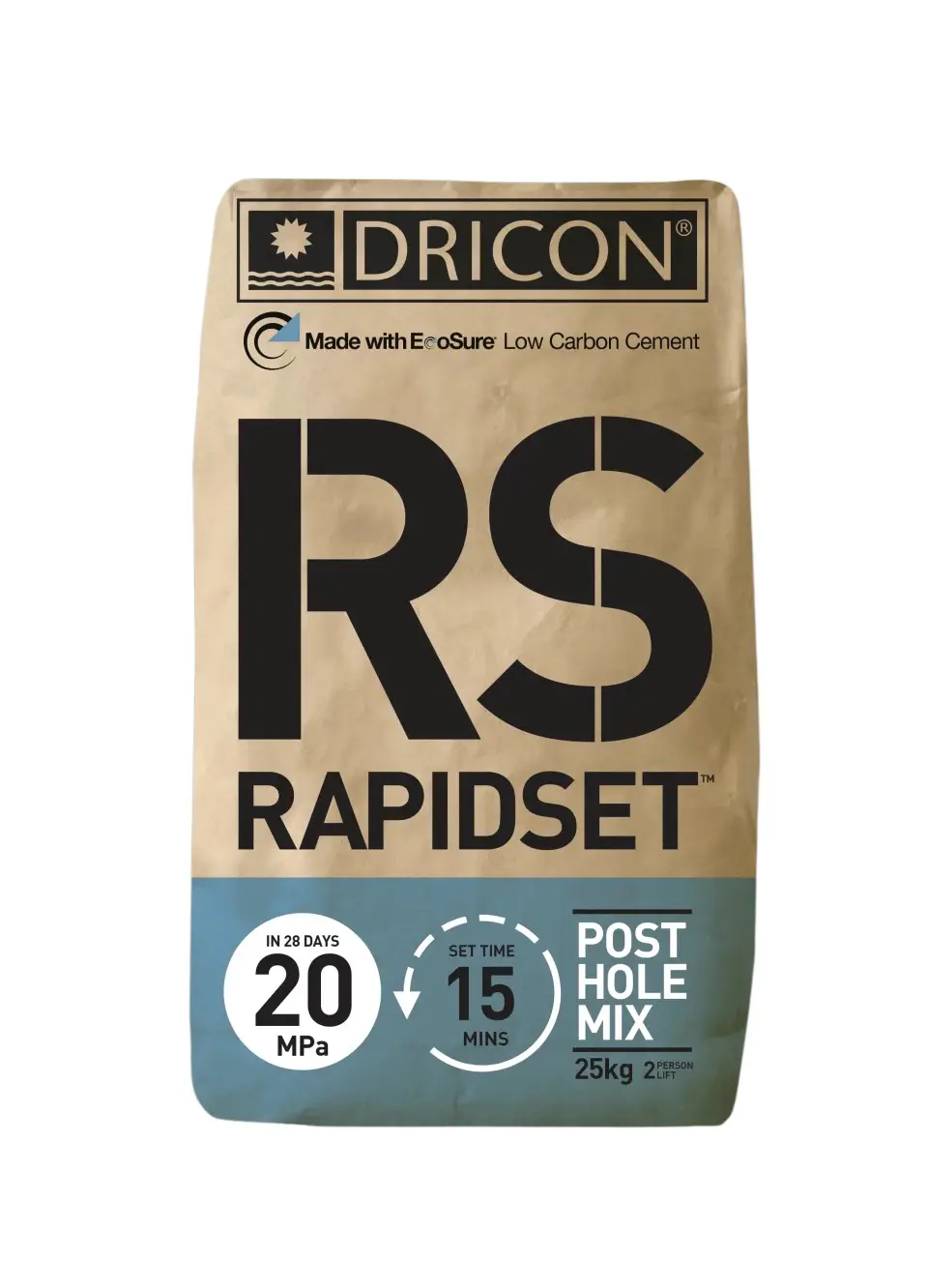 Dricon RapidSet is a dry bagged, premixed structural concrete designed for fast, hassle-free post hole installations. Formulated with special additives, it sets in just 15 minutes at 21°C—accelerating in warmer conditions and slowing slightly in colder weather.